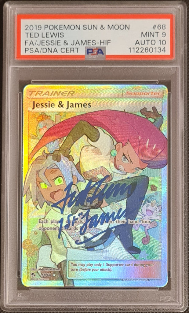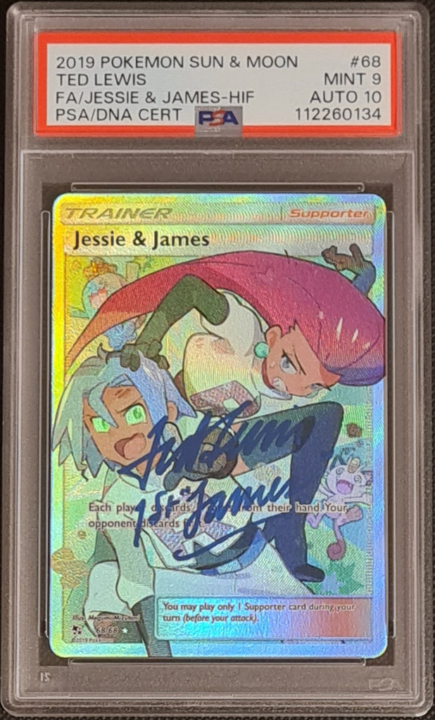 Pokemon Sun and Moon Hidden Fates Jessie and James #68/68 PSA 9/AUTO 10 Full Art Ultra Rare Holo Trading Card (Signed by Ted Lewis)