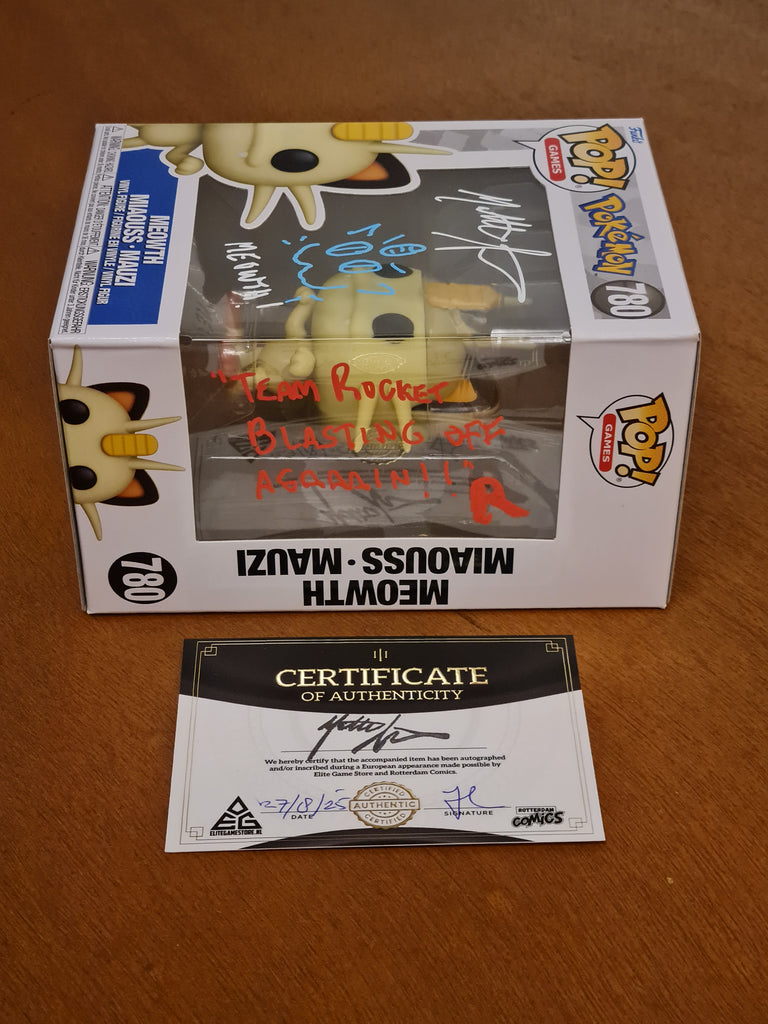 Note: This Funko comes with an autograph, a Meowth head-sketch and written 'Meowth' quote!!