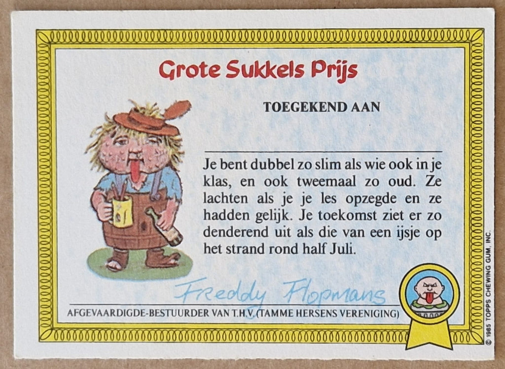 This card is part of the Dutch test set released in the Netherlands in 1985. This 'test' set only featured the 'a' name version of each of the characters in this set.